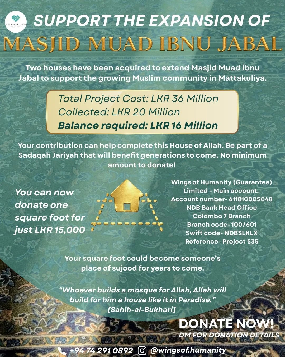 The Messenger of Allah said: “Whoever builds a mosque for the sake of Allah, like a sparrow’s nest for Allah or even smaller, Allah will build for him a house in Paradise.”